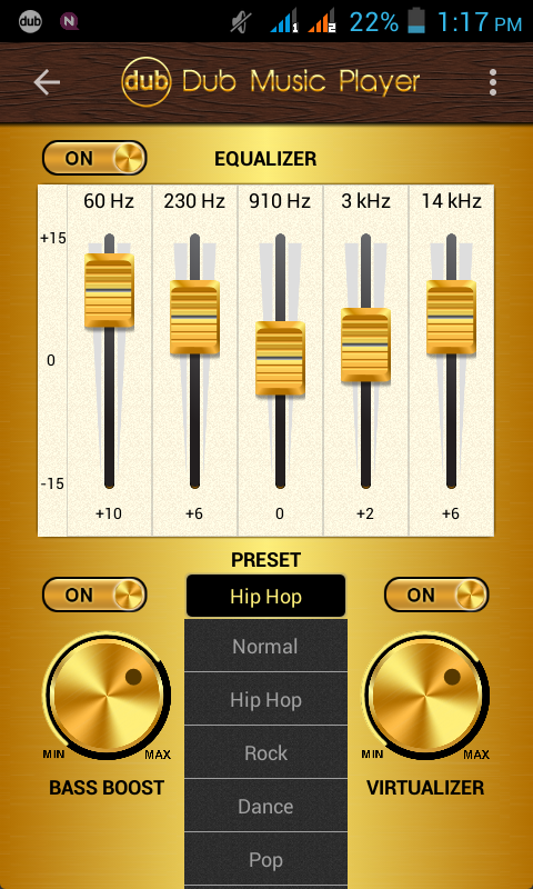 The playerPro music player has a 5 band equalizer which you can use to produce that effective sound you desire to hear. The equalizer allows you to reset/control the bass effect, set and create a customized preferred presets, save your settings if you like. Below is a grid picture of the screenshots I shot for illustration.
